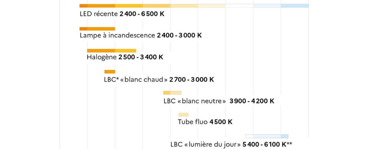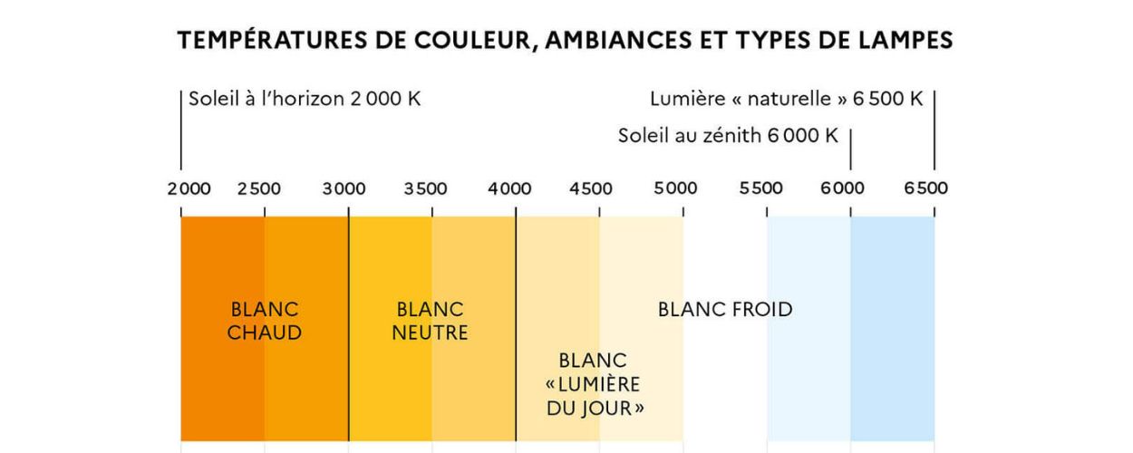 La température de couleur, mesurée en kelvins (K), joue un rôle essentiel dans l’ambiance d’une pièce. De plus elle varie selon l’utilisation et l’environnement :
